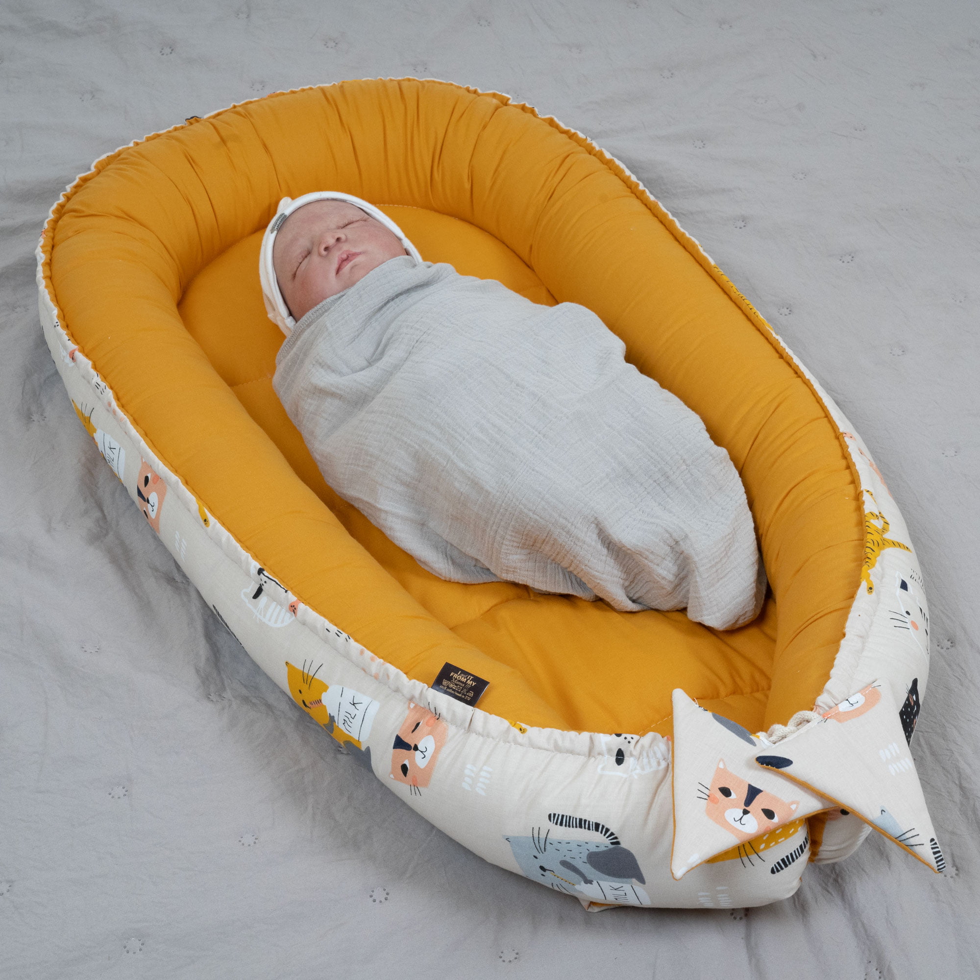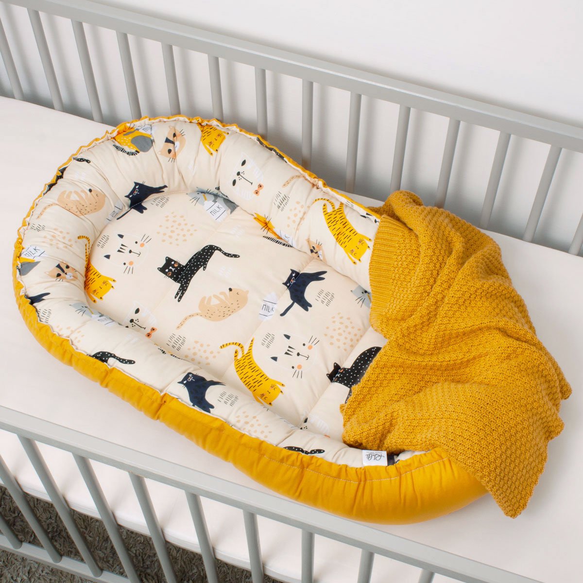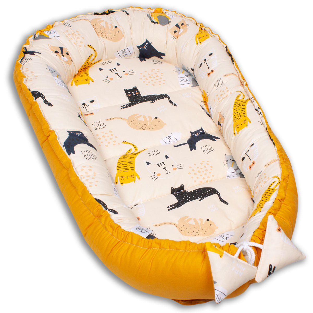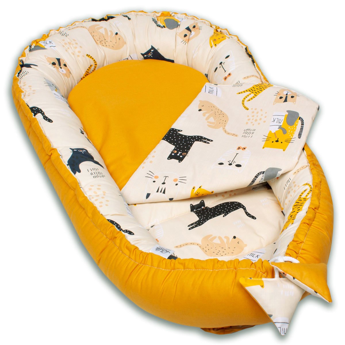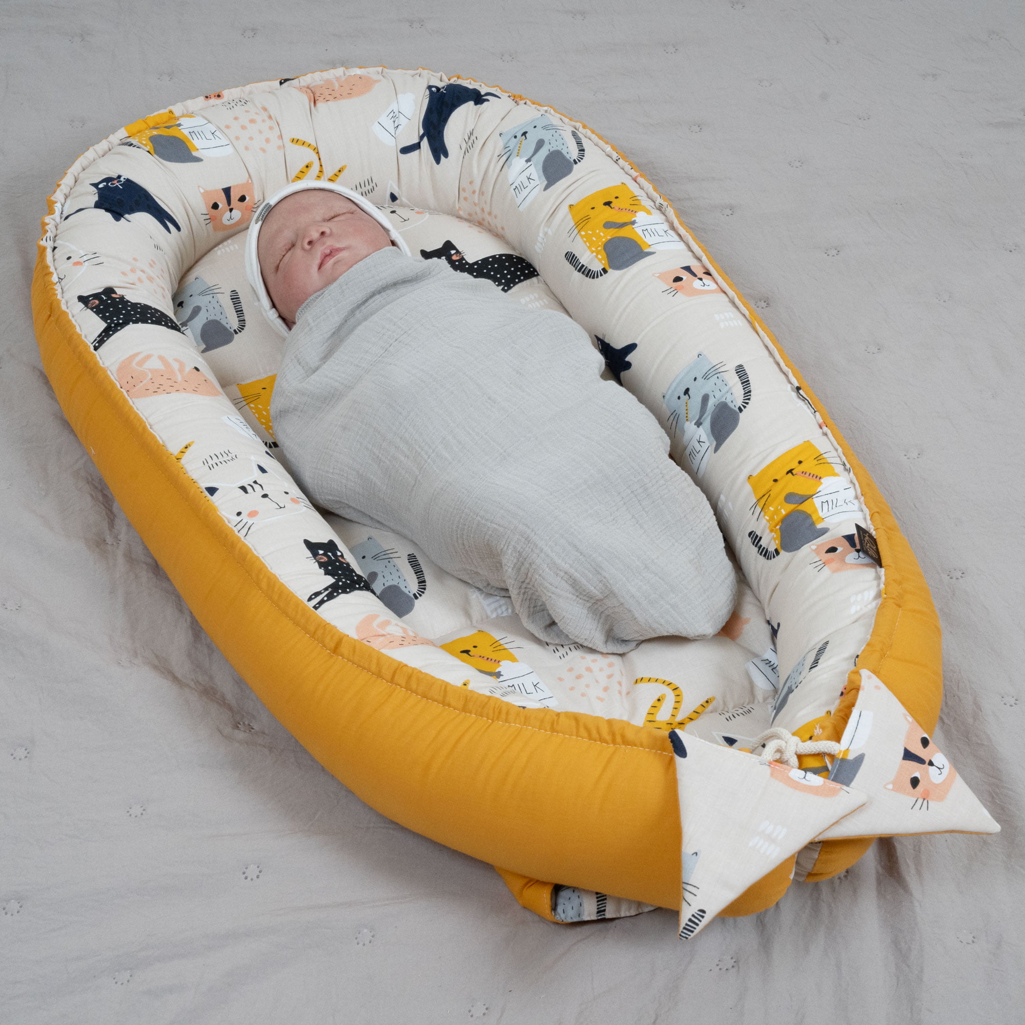 Dwustronny kokon niemowlęcy Premium z dodatkowym wkładem ułatwiającym utrzymanie czystości. Motyw przewodni to kociaki w rożnych barwach.