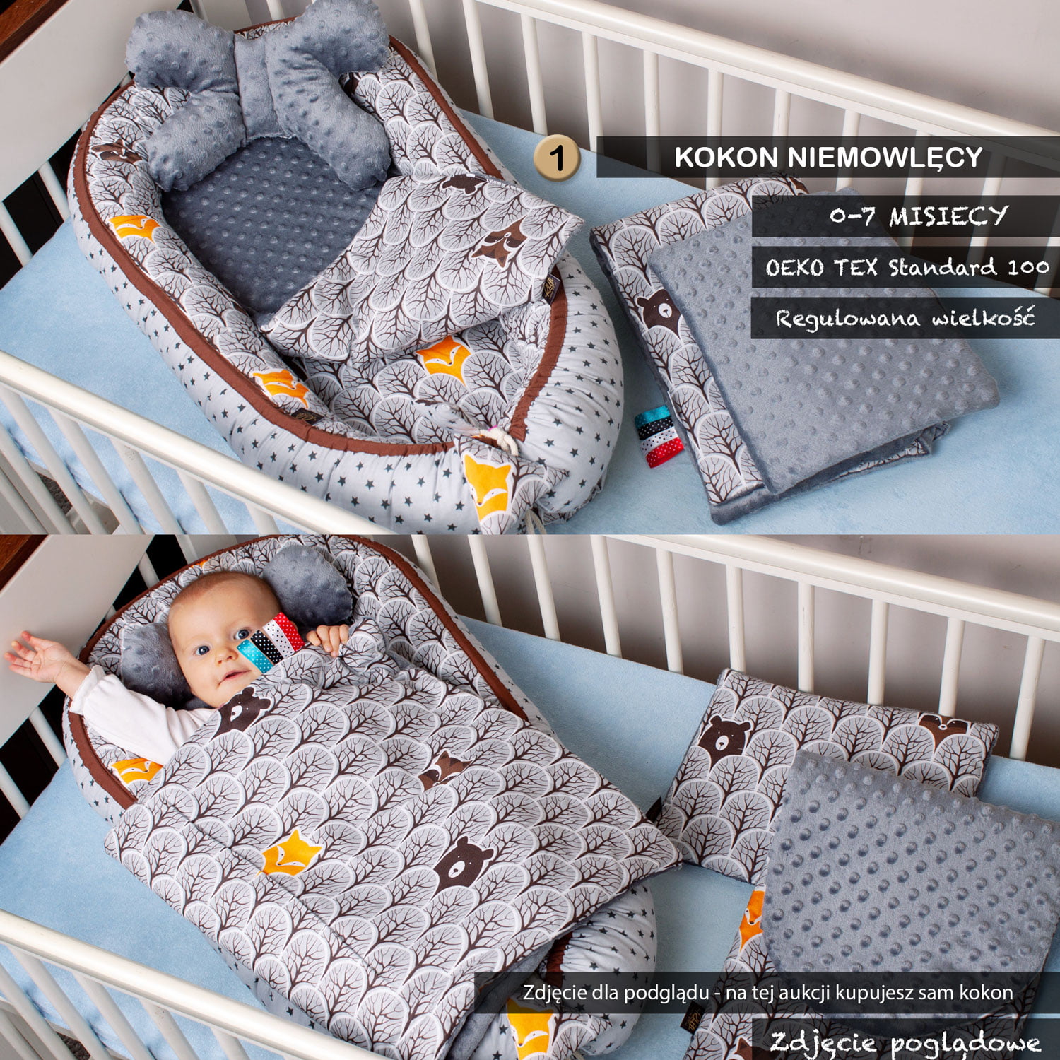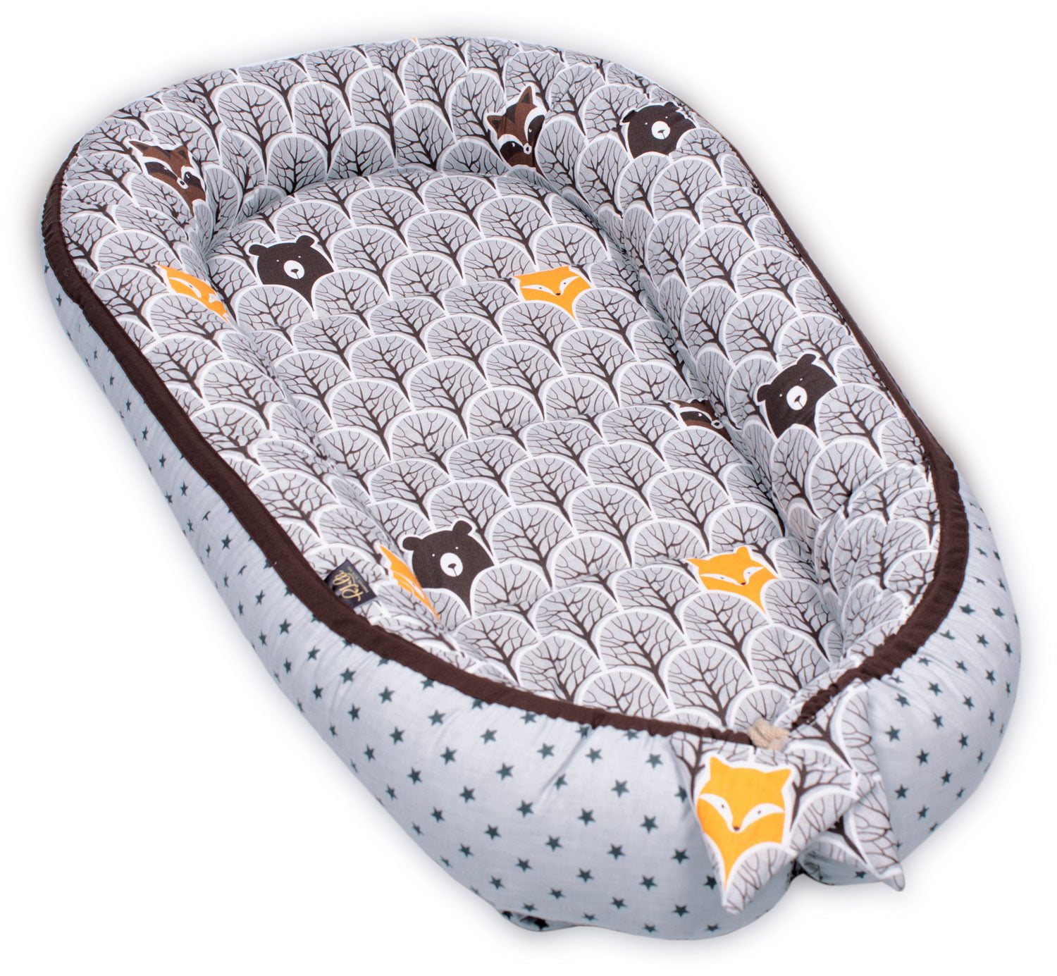 Dwustronny kokon niemowlęcy Premium. Motyw przewodni to leśne zwierzątka. Połączenie gwiazdek na szarym tle z motywem ukrytych w drzewach zwierząt i brązową lamówka.