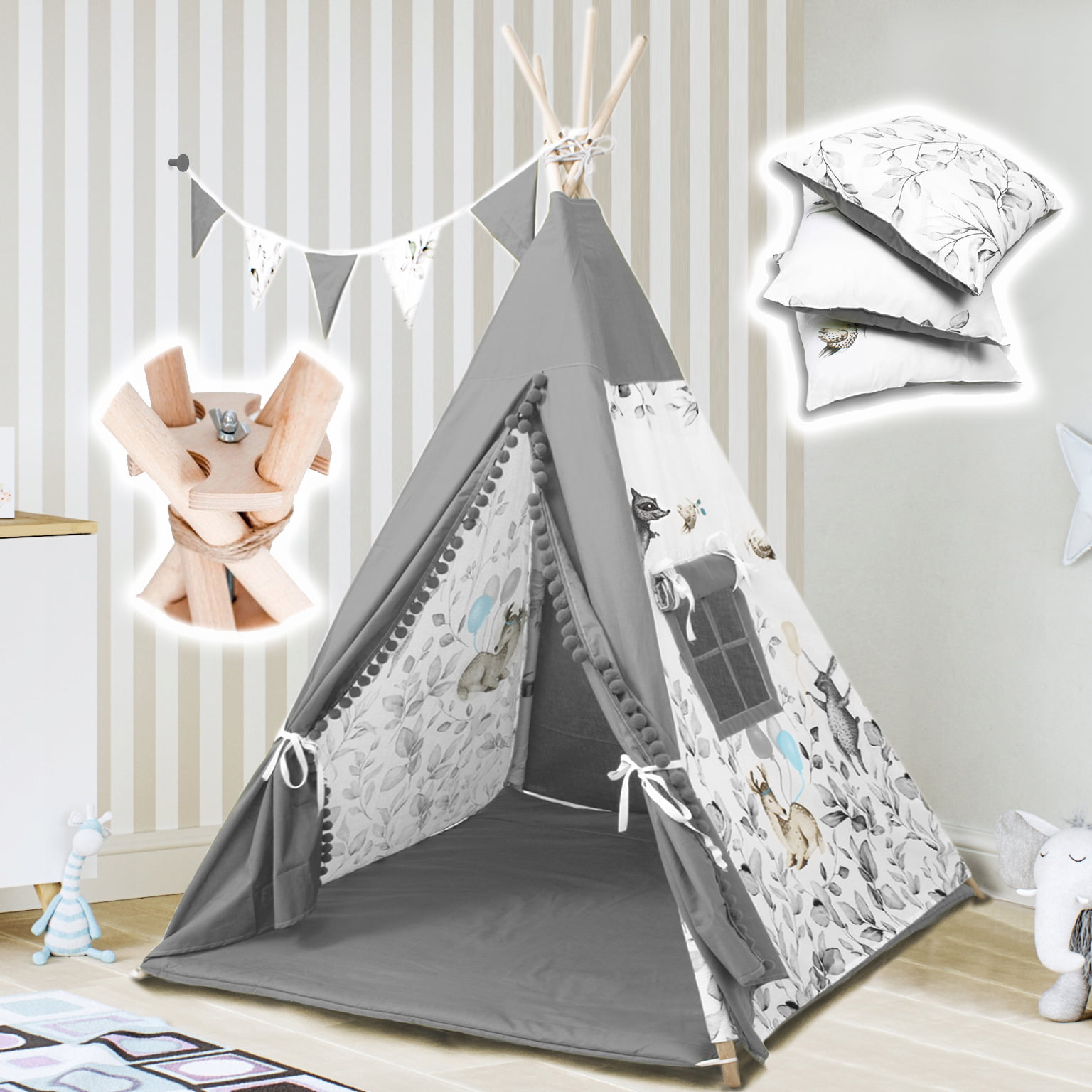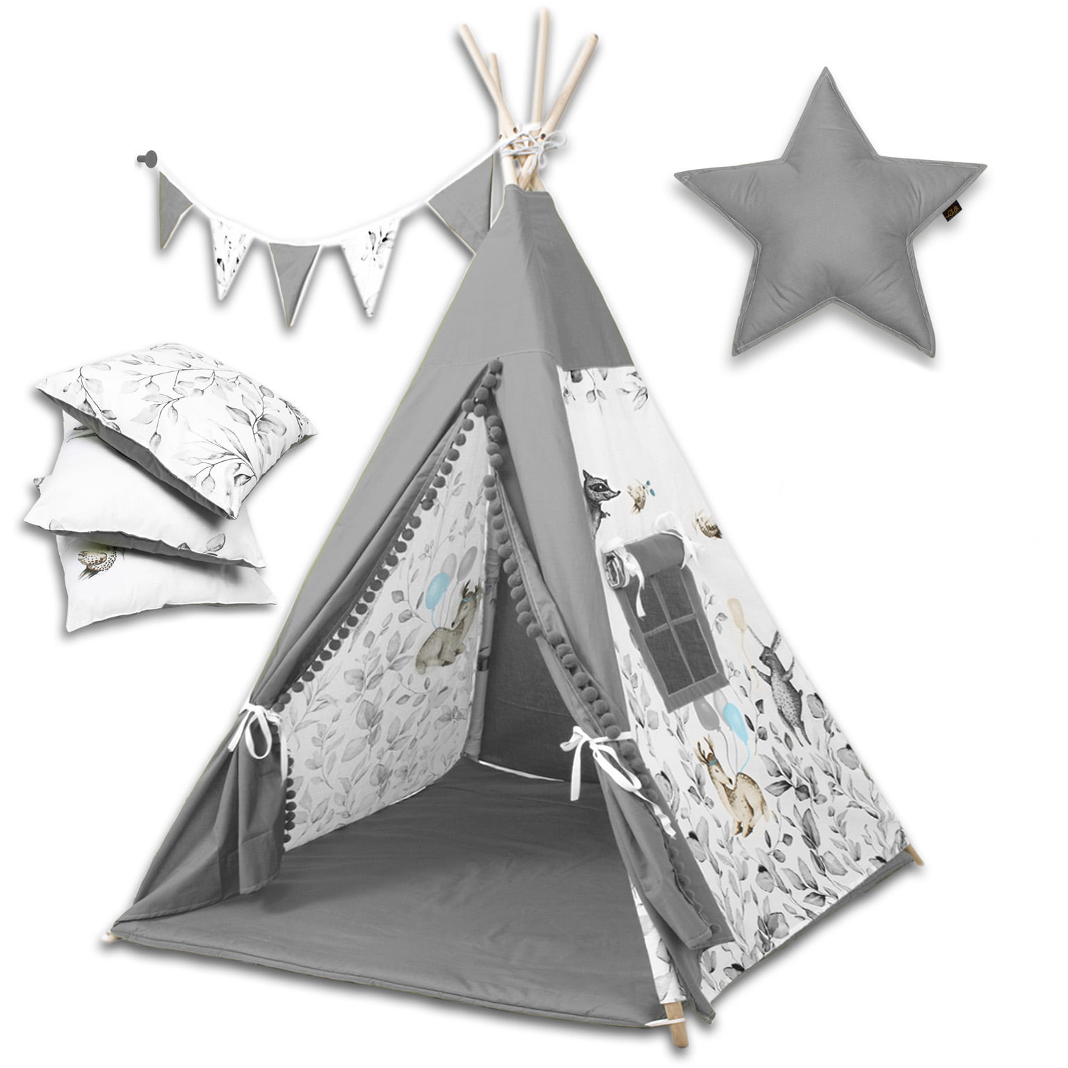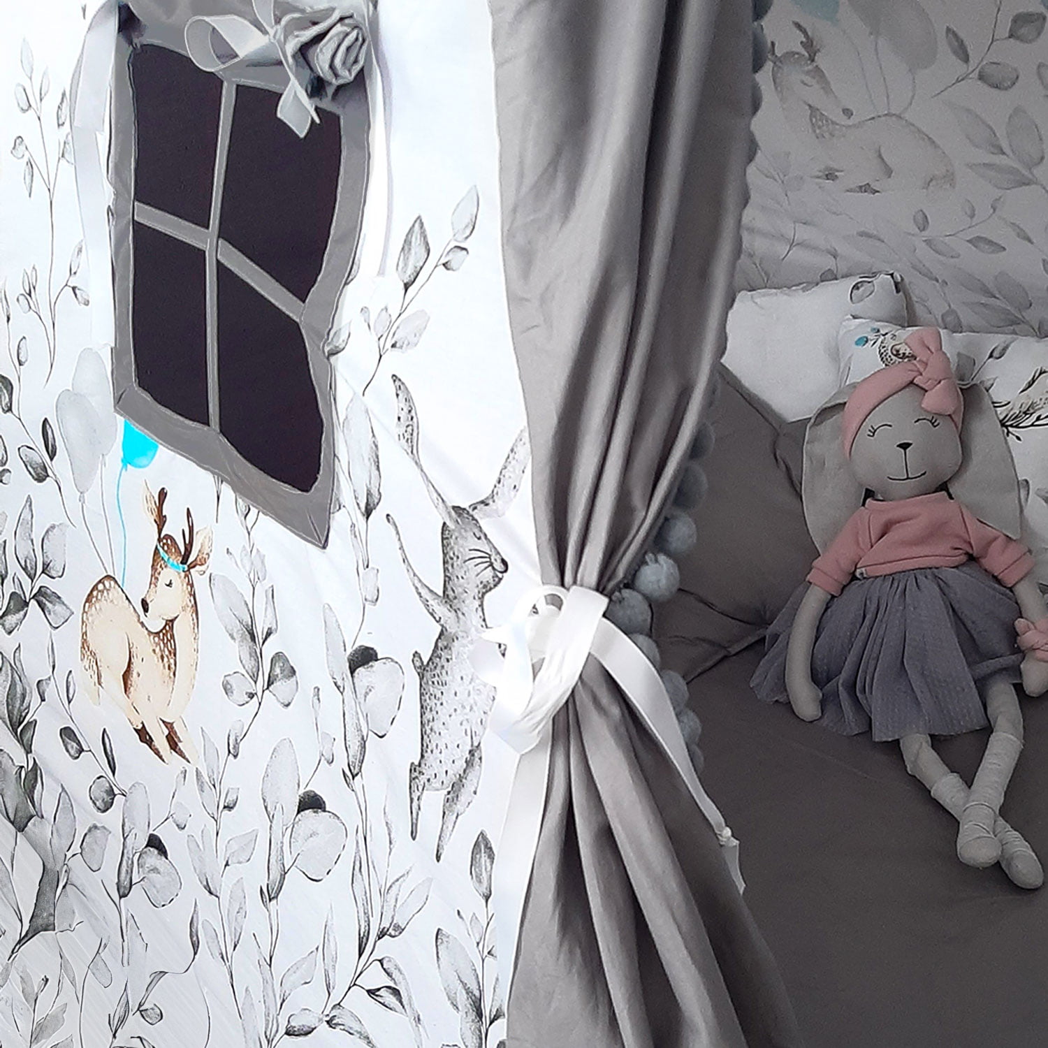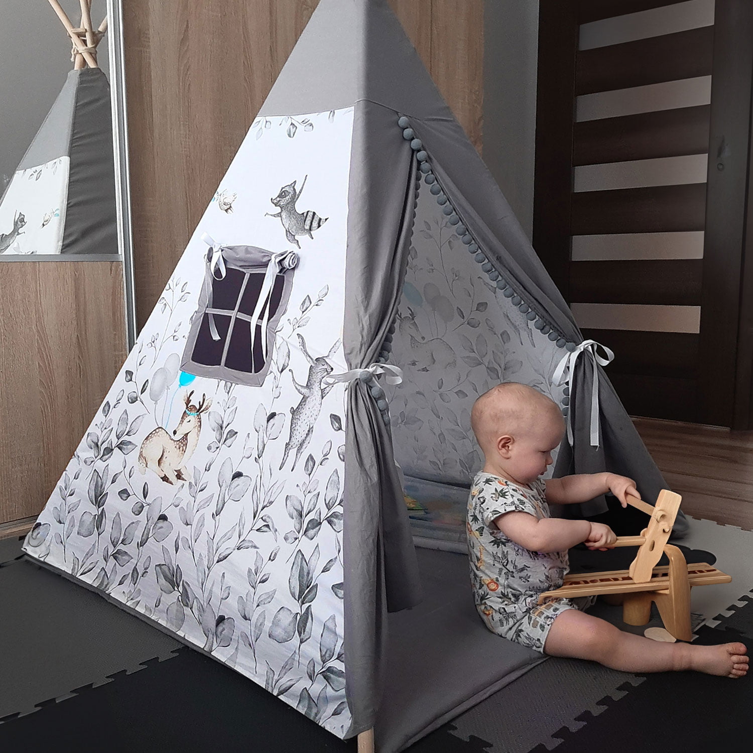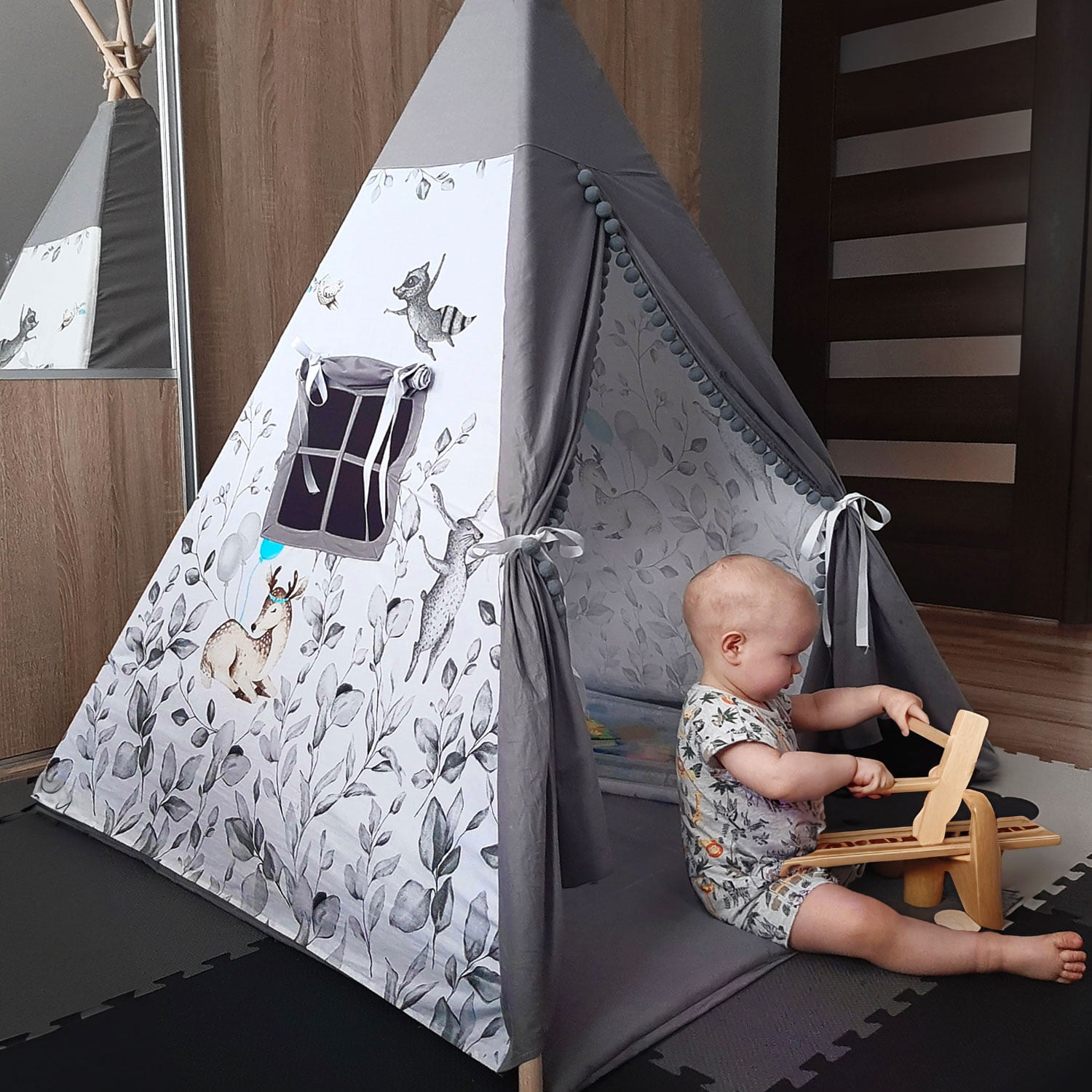 Namiot dla dzieci TIPI – Zestaw Duży 7 elementowy – Szary Tipi z Jelonkiem