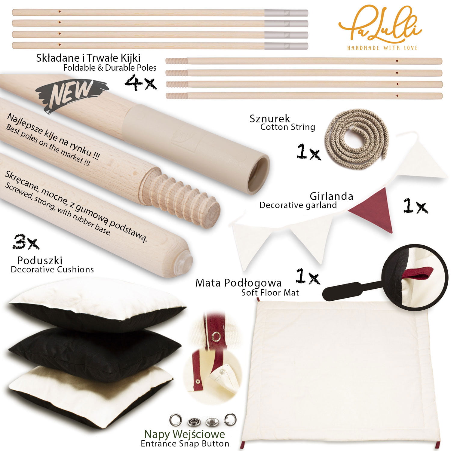 W zestawie również drewniany stabilizator – gwarantuje on usztywnienie konstrukcji i dużo bardziej bezpieczne użytkowanie. Podczas energicznej zabawy, kije nie będą przemieszczały się względem siebie co zapobiega samoistnemu składaniu się namiotu i zwiększa komfort zabawy. Namiot zabezpieczony stabilizatorem, możemy przenosić z miejsca na miejsca bez składania całej konstrukcji.