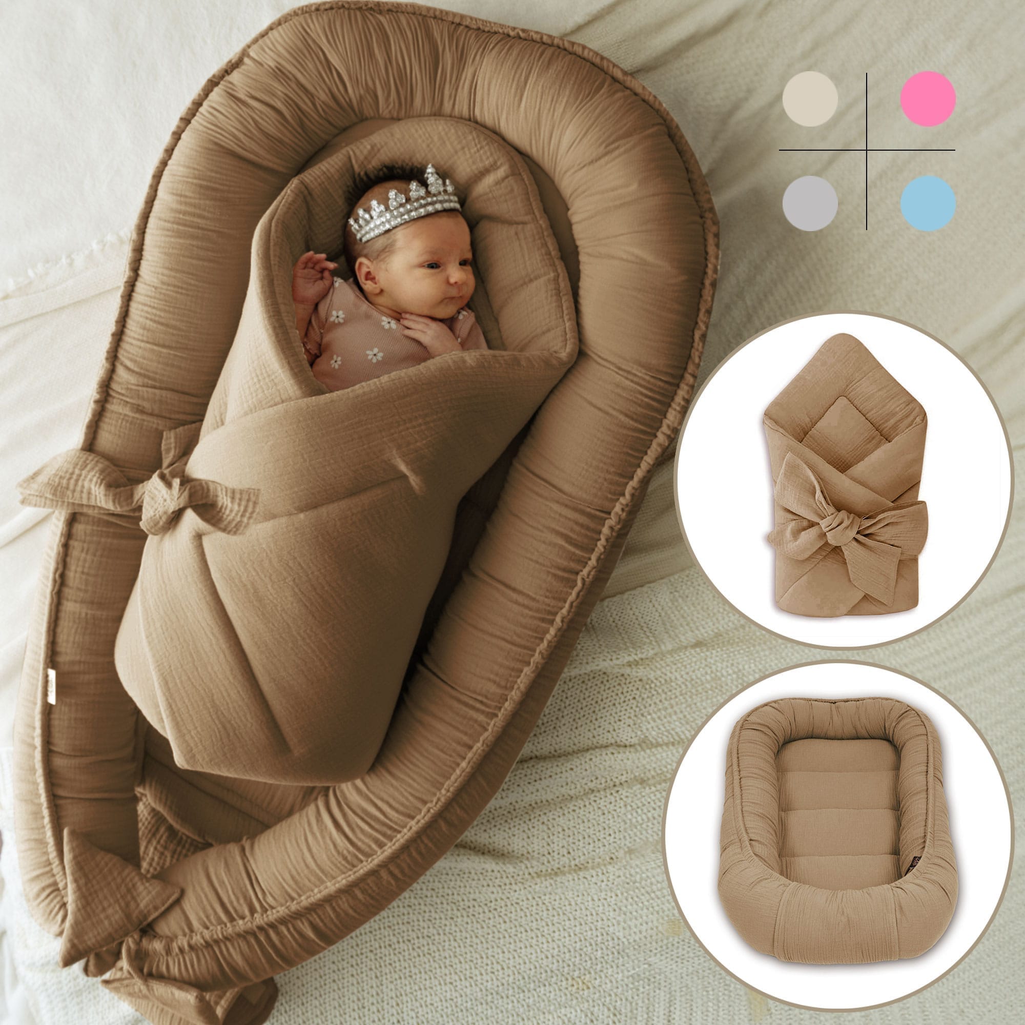 Zestaw 2w1 PaLulli® PREMIUM – Kokon niemowlęcy 100×60 cm + wiązany muślinowy rożek 75×75 cm – Jasny brązowy