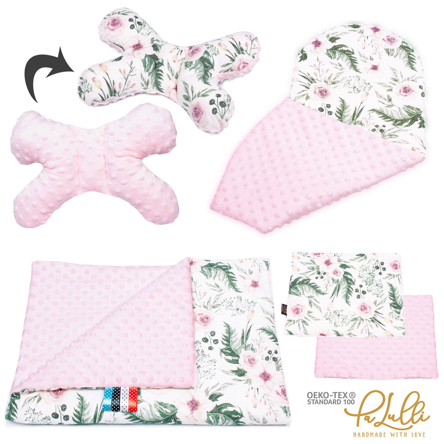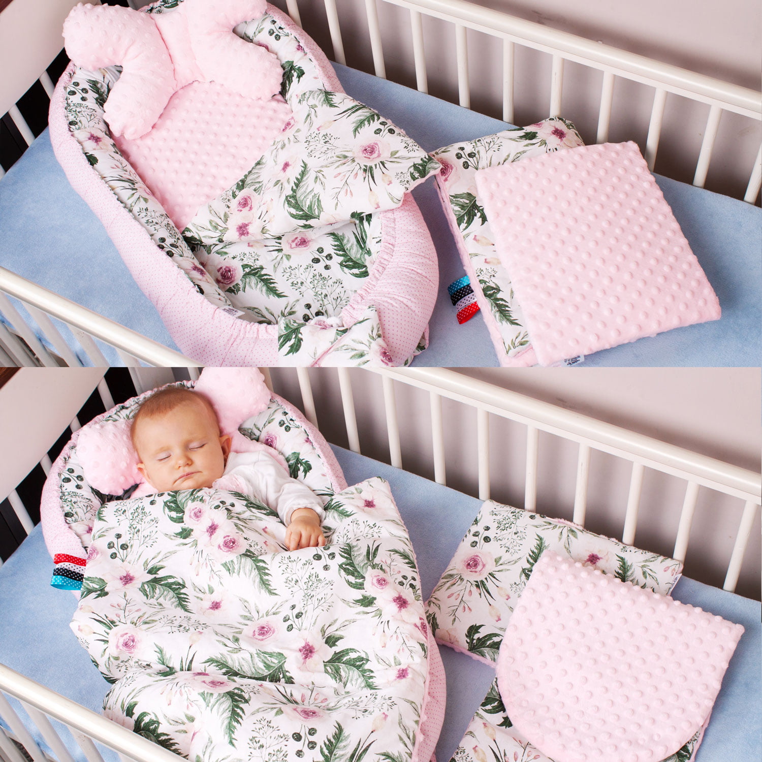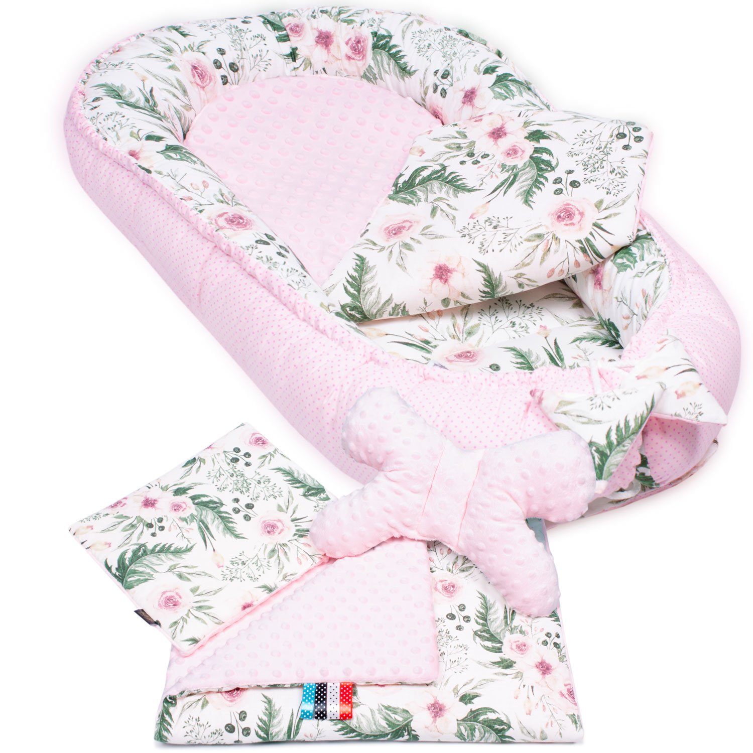 5-ięcio elementowy zestaw startowy dla niemowląt. Dwustronny kokon niemowlęcy Premium z dodatkowym wkładem ułatwiającym utrzymanie czystości. W zestawie rownież motylek płaska poduszeczka i kołderka z wszytymi metkami sensorycznymi.
